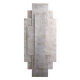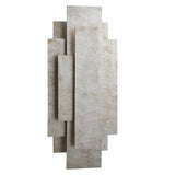 This art deco inspired wall light creates a warm glow via a series of textured panels that reflect and diffuse the light. The sculptural layers are finished in antique silver leaf, the perfect atmospheric interior addition.
