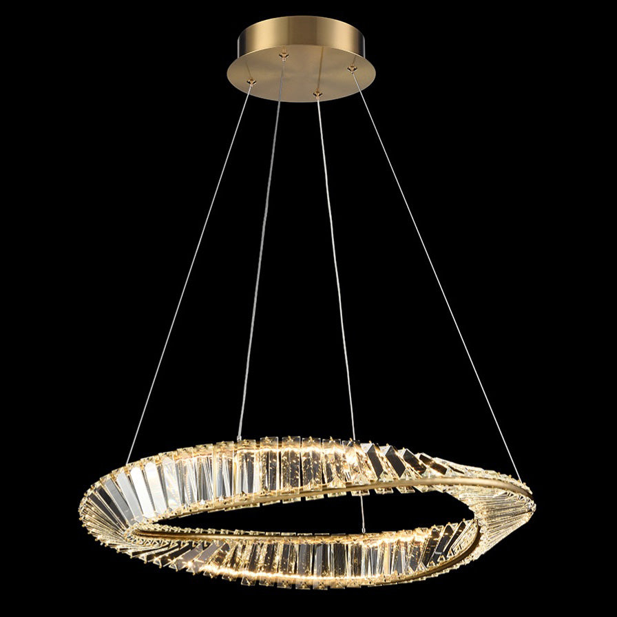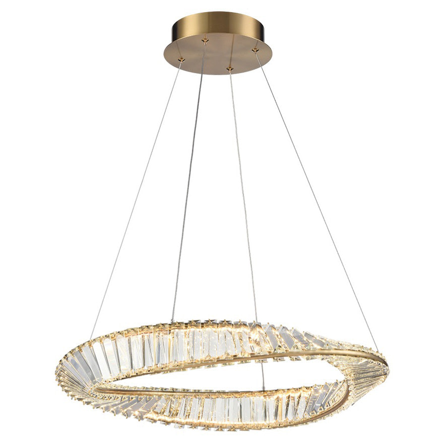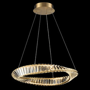 Aged brass finish LED pendant featuring twisted metalwork adorned with rectangular crystals. The pendant is dimmable with a trailing edge dimmer.
