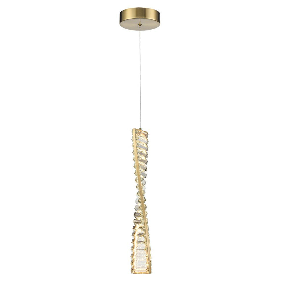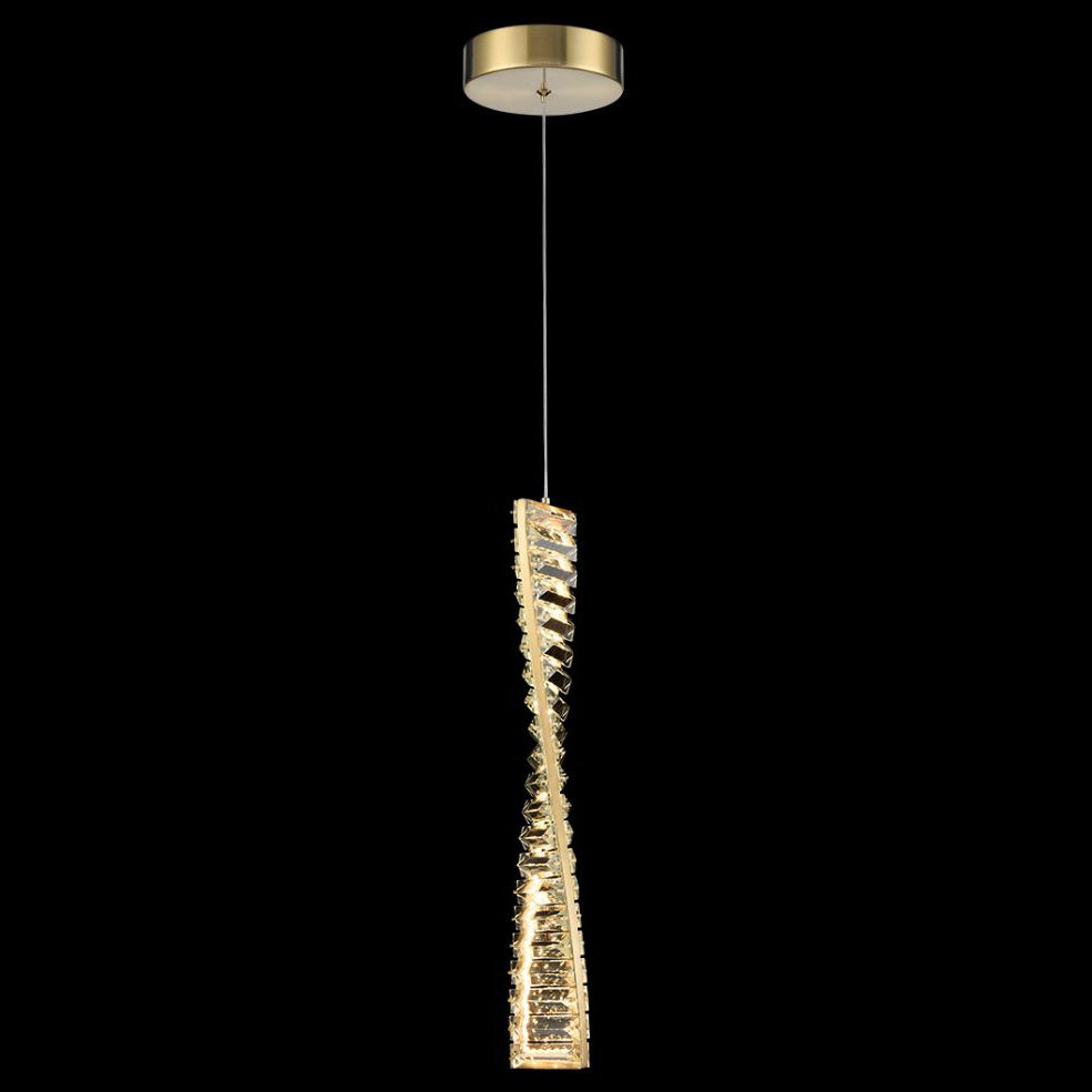 Aged brass finish LED pendant featuring twisted metalwork adorned with rectangular crystals. The pendant is dimmable with a trailing edge dimmer.
