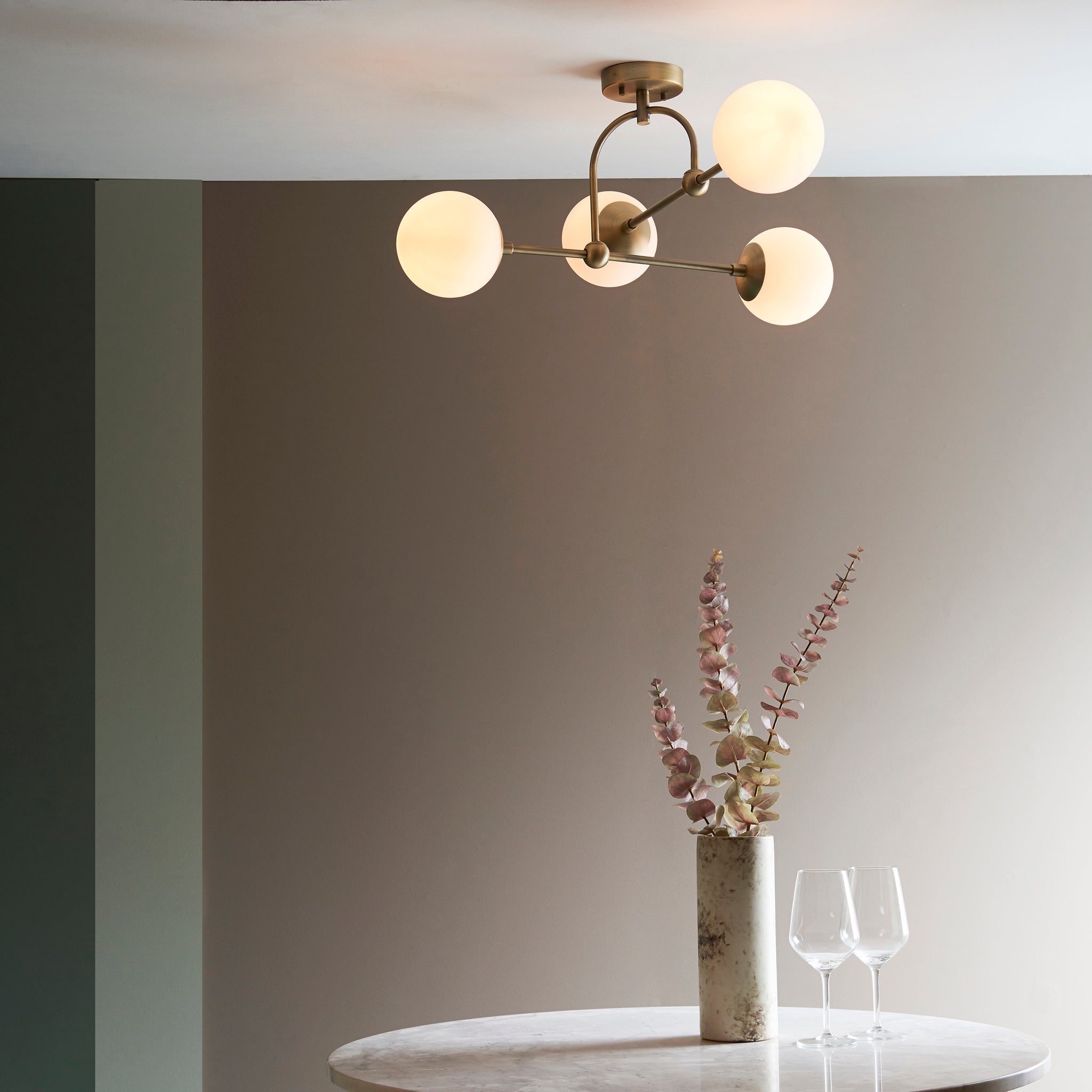 An impressive Globe Design ceiling light, finished in matt antique brass with opal glass shades.