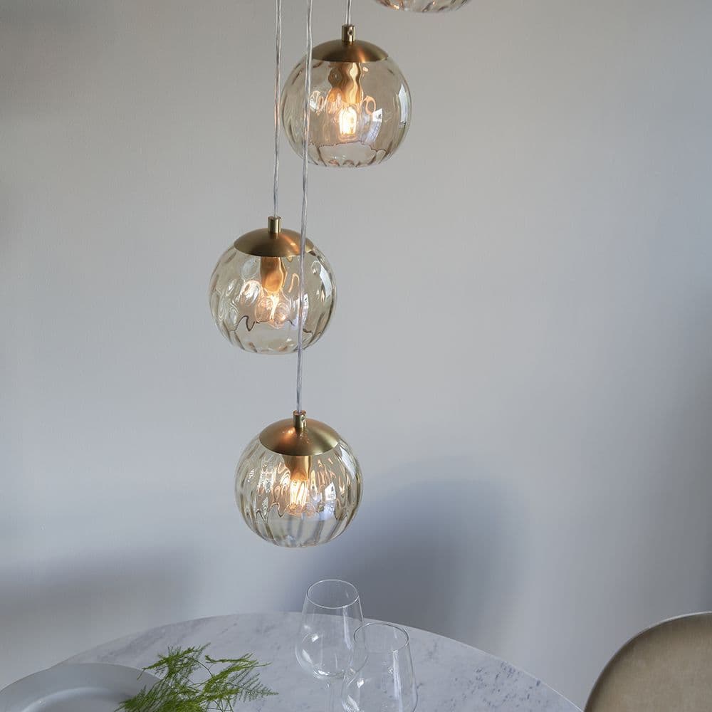 A modern classic 3 light pendant with brushed brass plated finish and stunning champagne lustre dimpled glass shades. Adjustable in height to create the perfect hanging pendant. This pendant is also dimmable.