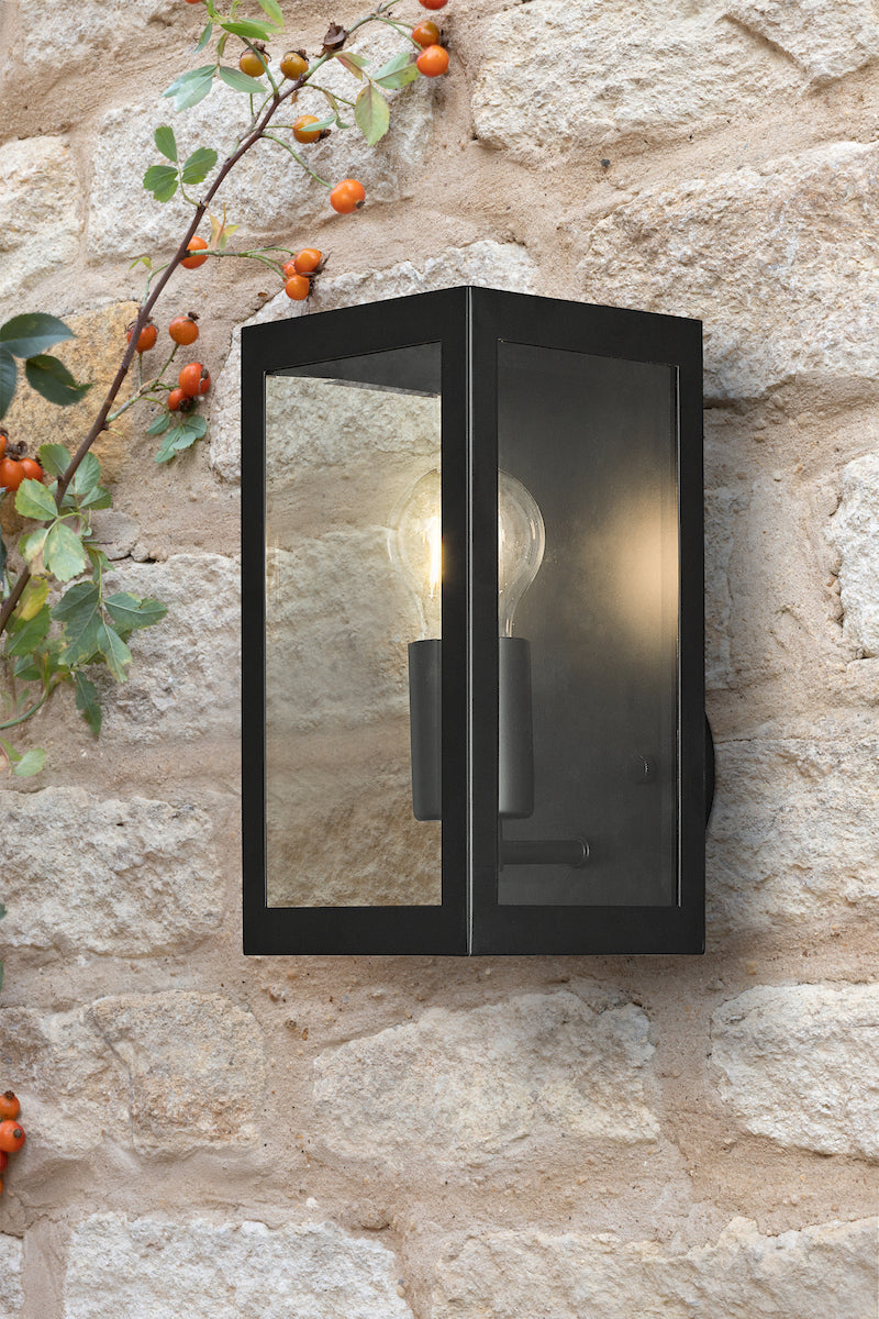For a touch of luxury, choose this single wall light for use outdoors. It has a modern, upright box style with clear, tempered glass panels featuring bevelled edges. It is finished in powder-coated matt black with matching lampholder.