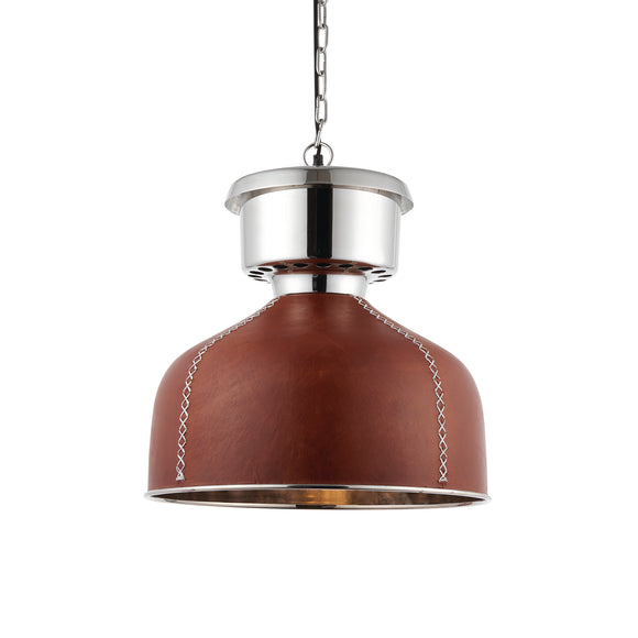 This pendant is moulded with golden brown leather and complemented by a bright nickel plated fitting. Compatible with LED lamps and dimmable