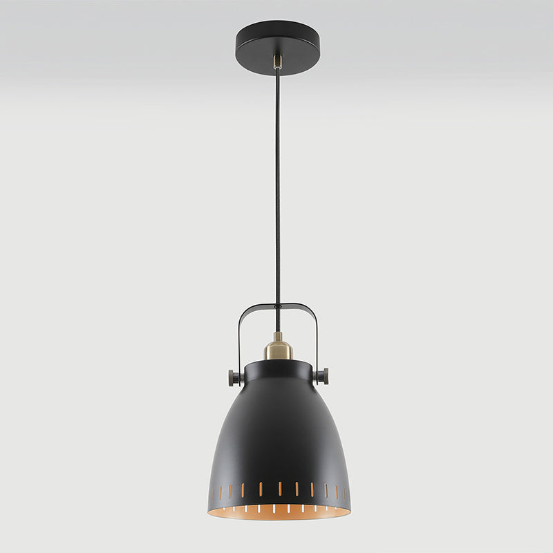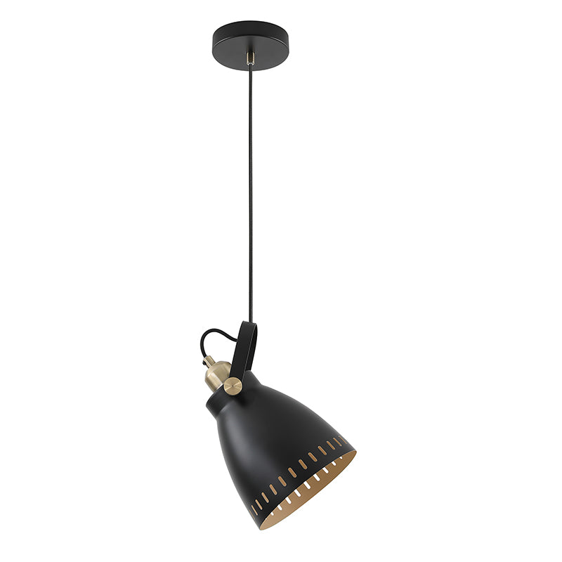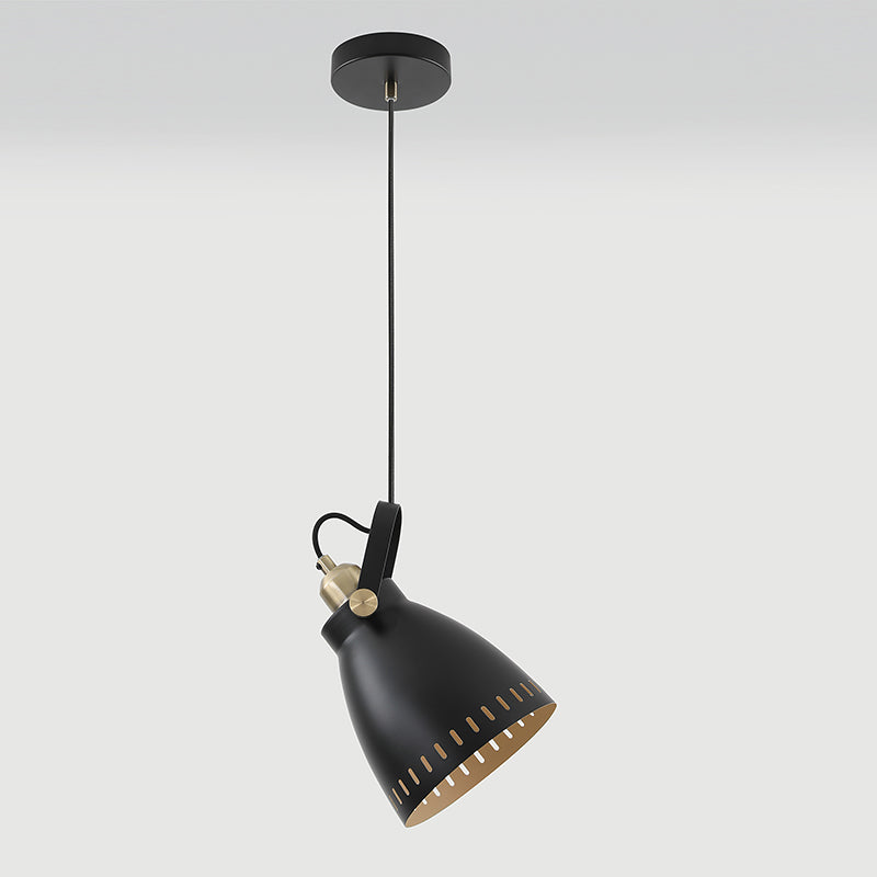 A comprehensive range which awards a number of original features to a classic design concept. A familiar metal, narrow domed shade houses the E27 lamp holder on a selection of pendants and matching wall, table and floor lamp. Our designers have given these adjustable fixtures a modern twist firstly with the colour finishes of each component. The majority of the fittings have a matt black finish with the lamp holders and adjustable bolts coated in antique brass. The most unique colour is on the inside of each shade which has a khaki finish; in order to further accentuate this whilst also adding another feature, the edge around the outer rims of the shades have small oval cut outs to display the inner shade and create fascinating shadows when illuminated.