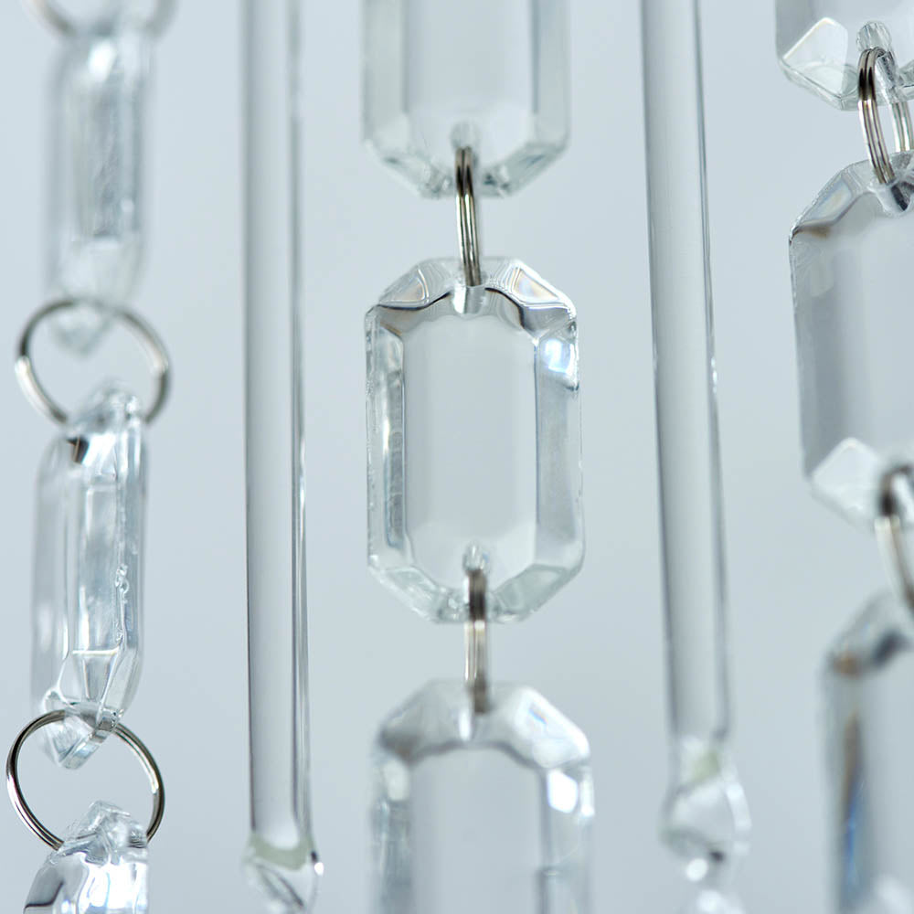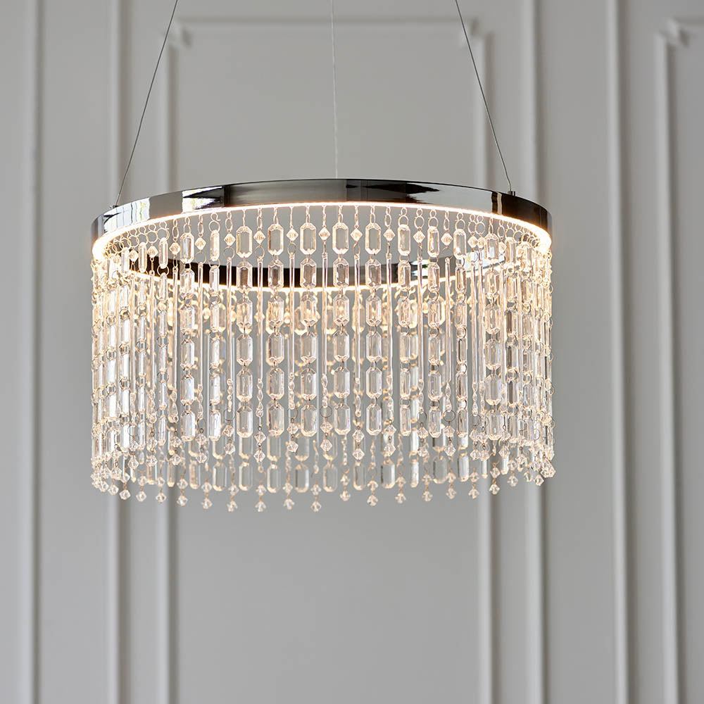 Cascading clear glass crystals hang from polished chrome ring creating beautiful refracting light. A statement piece that is energy efficient with integrated LED.