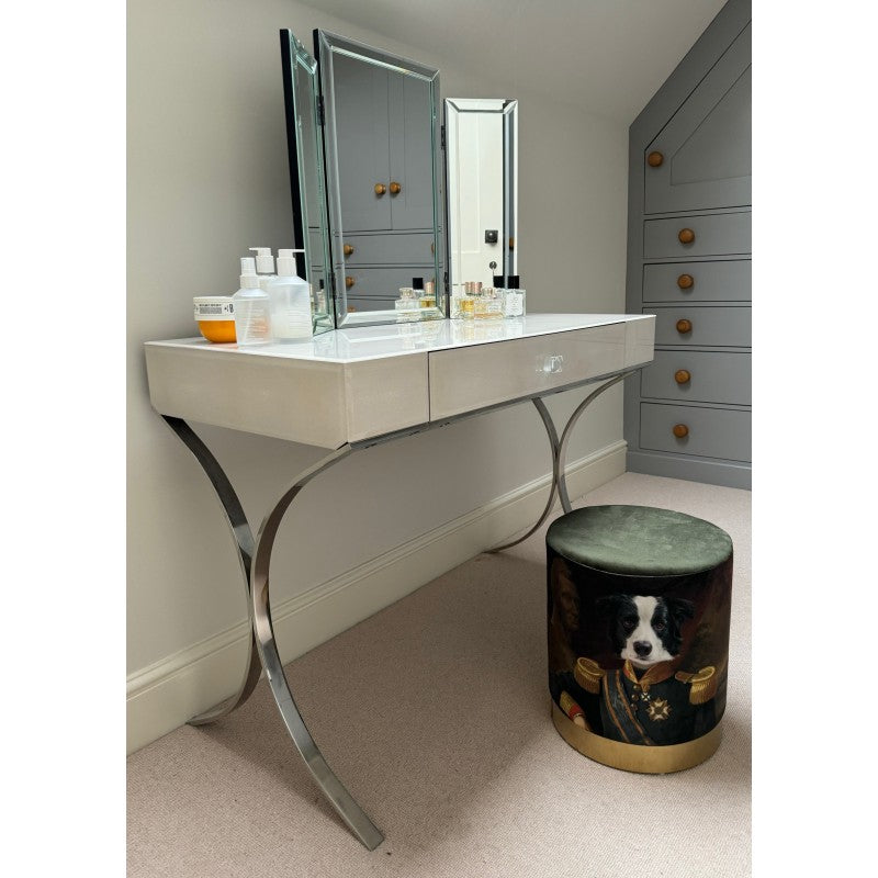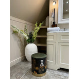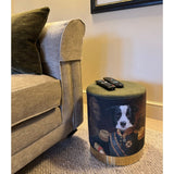 Both sides of the stool feature an anthropomorphic print depicting a Border Collie dog dressed in a vintage outfit. This fun stool can be used in any room as a statement interior styling feature.