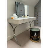 Quirky home interiors stool, covered in a green velvet fabric with a gold coloured metal base.