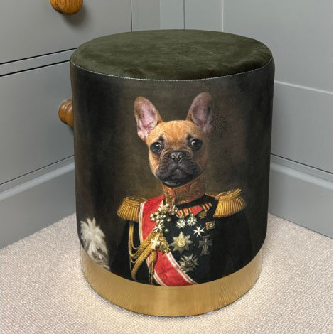 Both sides of the stool feature an anthropomorphic print depicting a French Bulldog dressed in a vintage Military uniform. This fun stool can be used in any room as a statement interior styling feature.