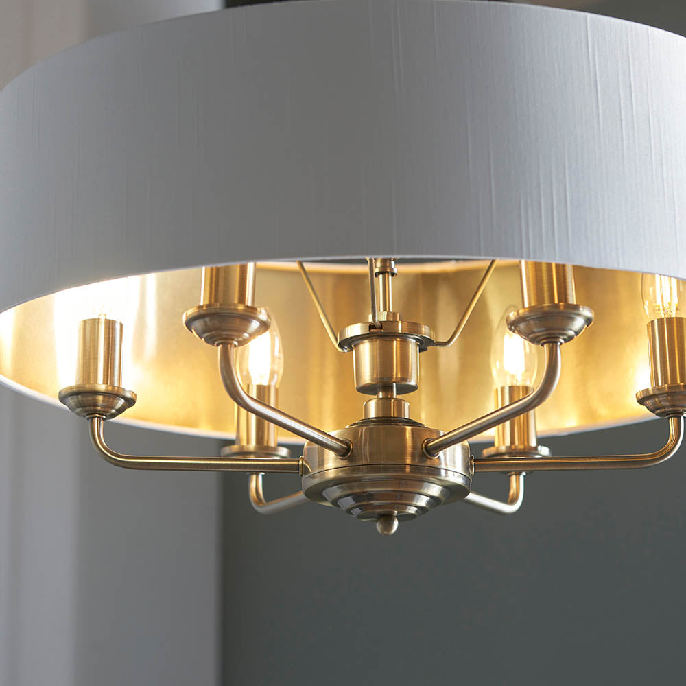 This multi arm pendant is a sophisticated mix of vintage white fabric shade lined with gold metallic inner and antique brass plated metalwork. This statement light is the perfect timeless addition to modern and classic homes of today.