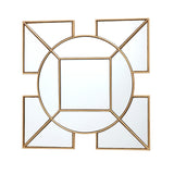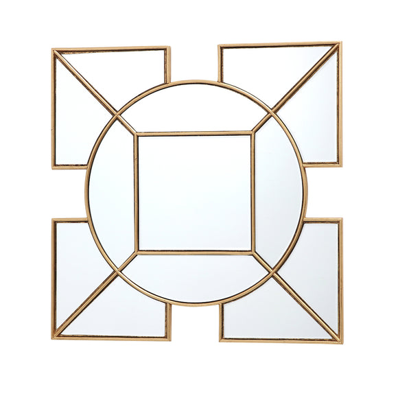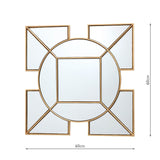 This Art Deco inspired mirror features a beautiful design with 4 squares surrounding the central round mirror. Complete with gold foil detail, creating a striking decorative mirror that will add a warming touch to any living space.