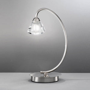 In satin nickel finish with small clear crystal glasses which have a frosted inner. There is a switch on the base.