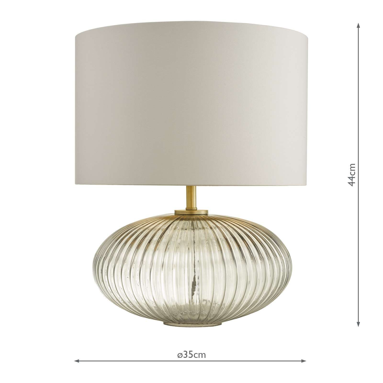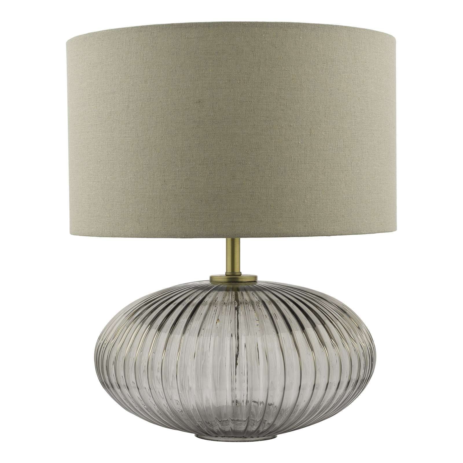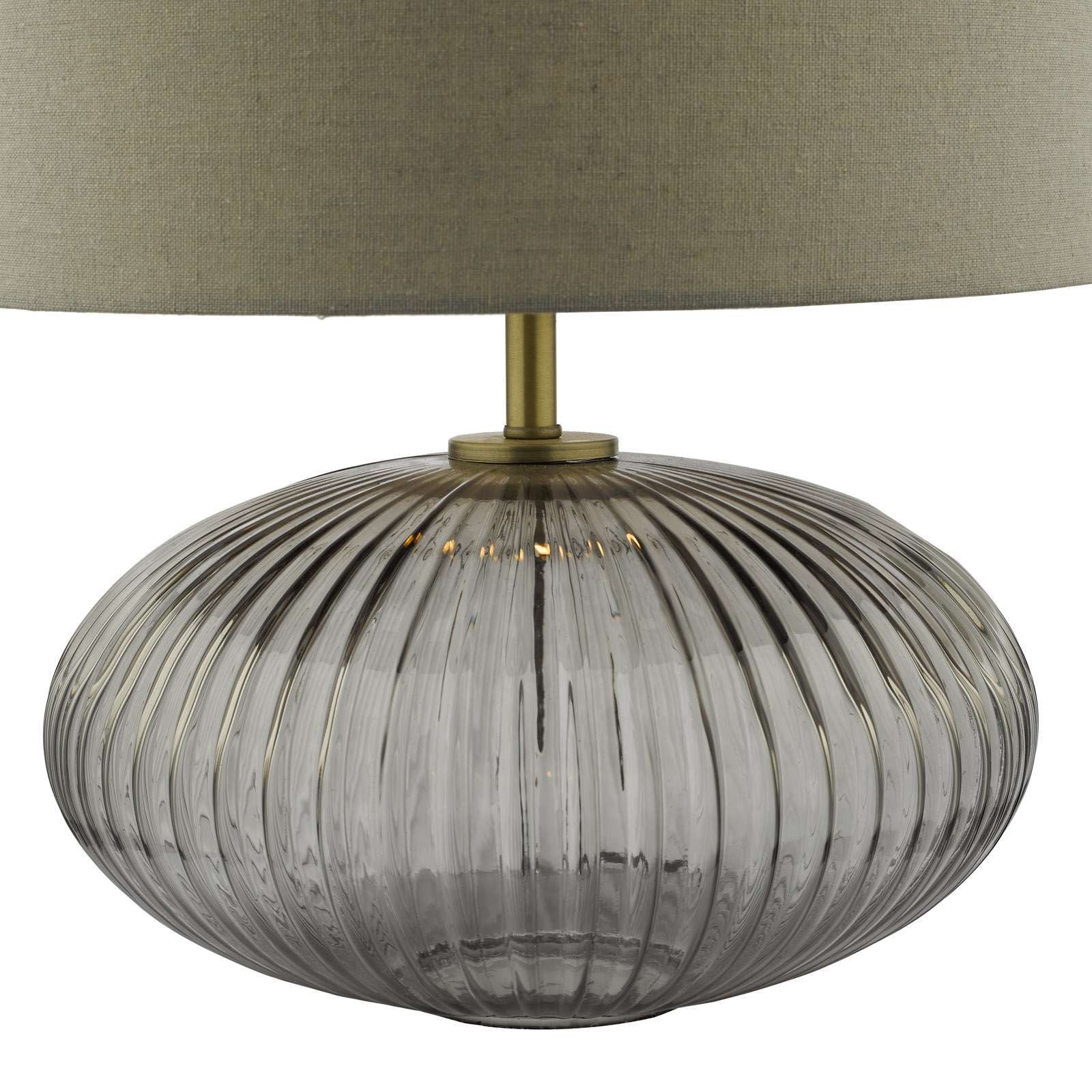 This table lamp has a modern ribbed glass base in smoked glass with antique brass details and a grey braided cable.