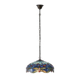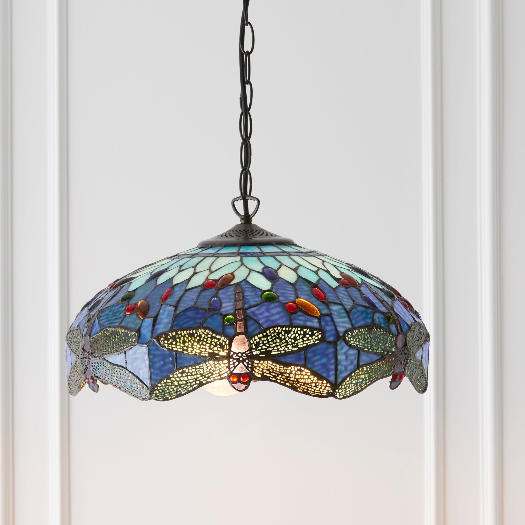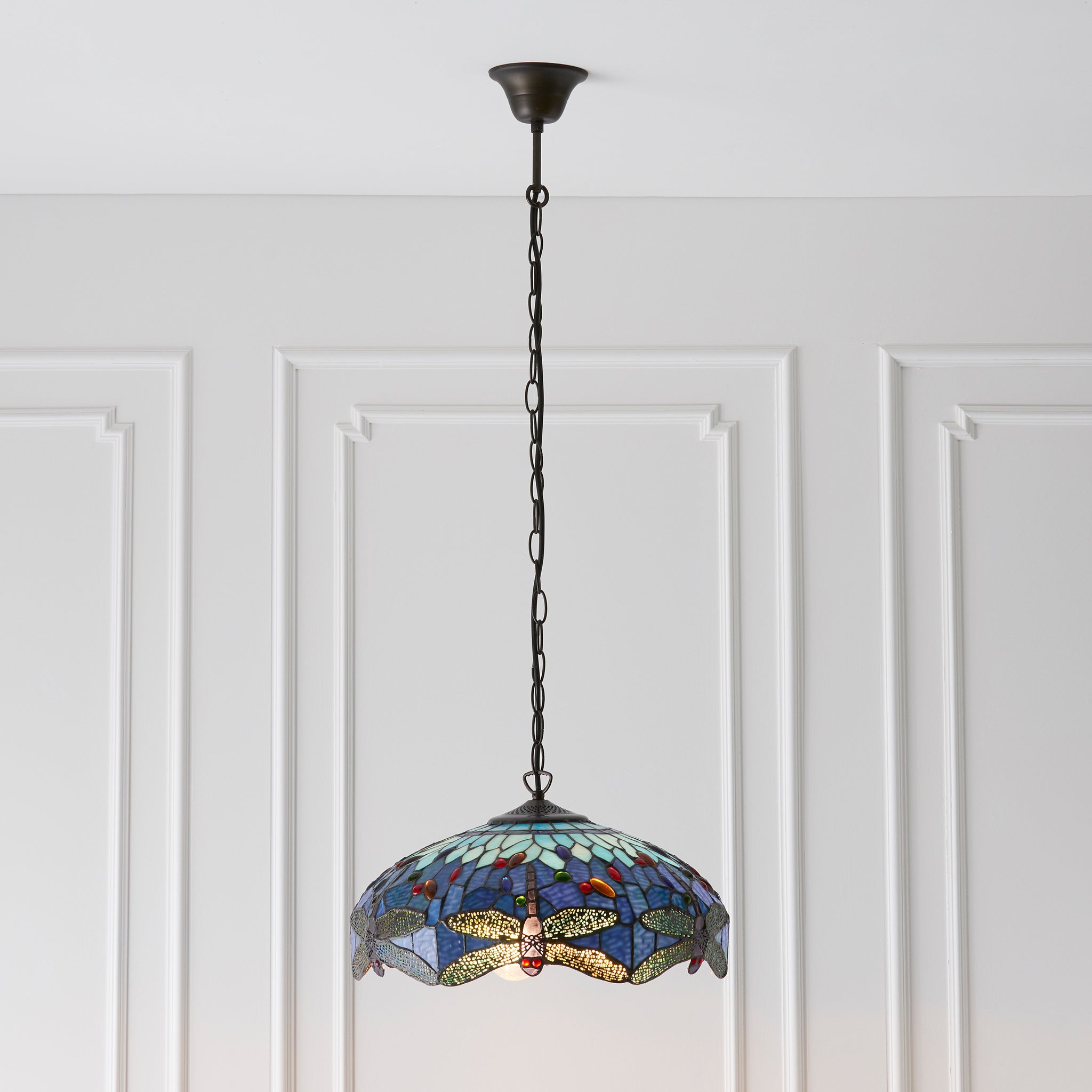 A stunning 3 light pendant with the iconic Tiffany design in a vivid blues with multi coloured glass beading. Teamed with a dark bronze effect fitting. Dimmable and compatible with LED lamps