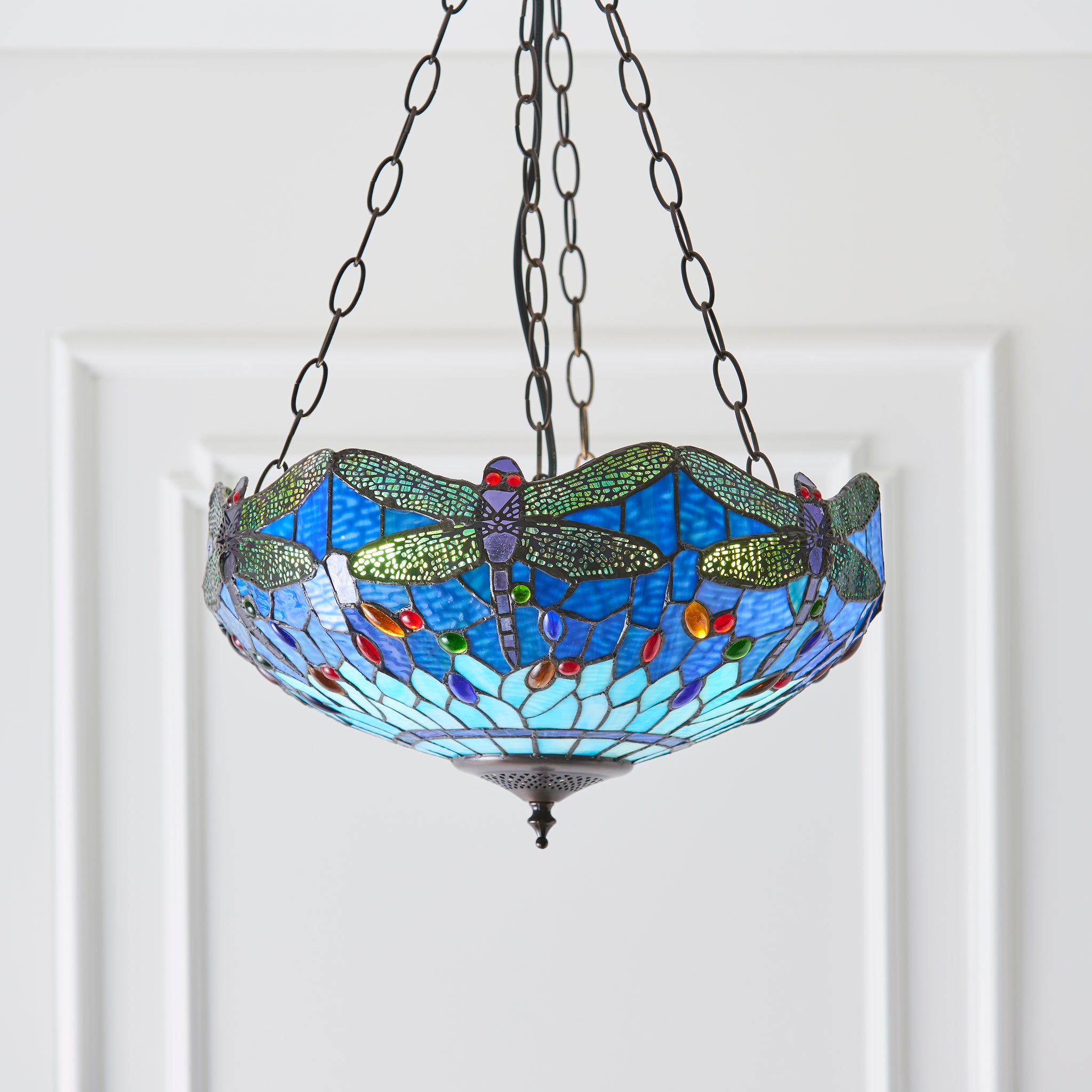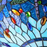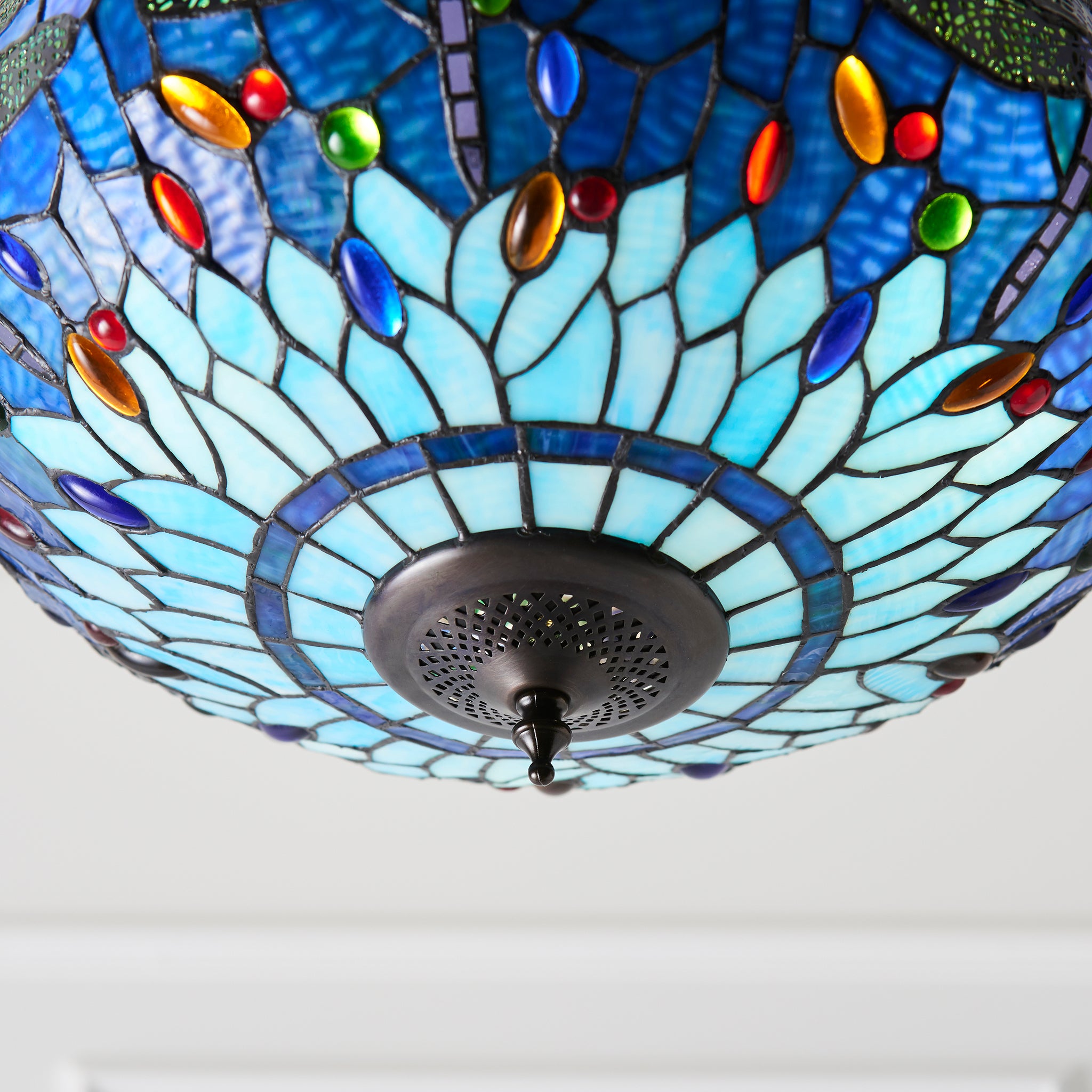 A stunning inverted pendant with the iconic Tiffany design in a vivid blues with multi coloured glass beading. Teamed with a dark bronze effect fitting. Dimmable and compatible with LED lamps