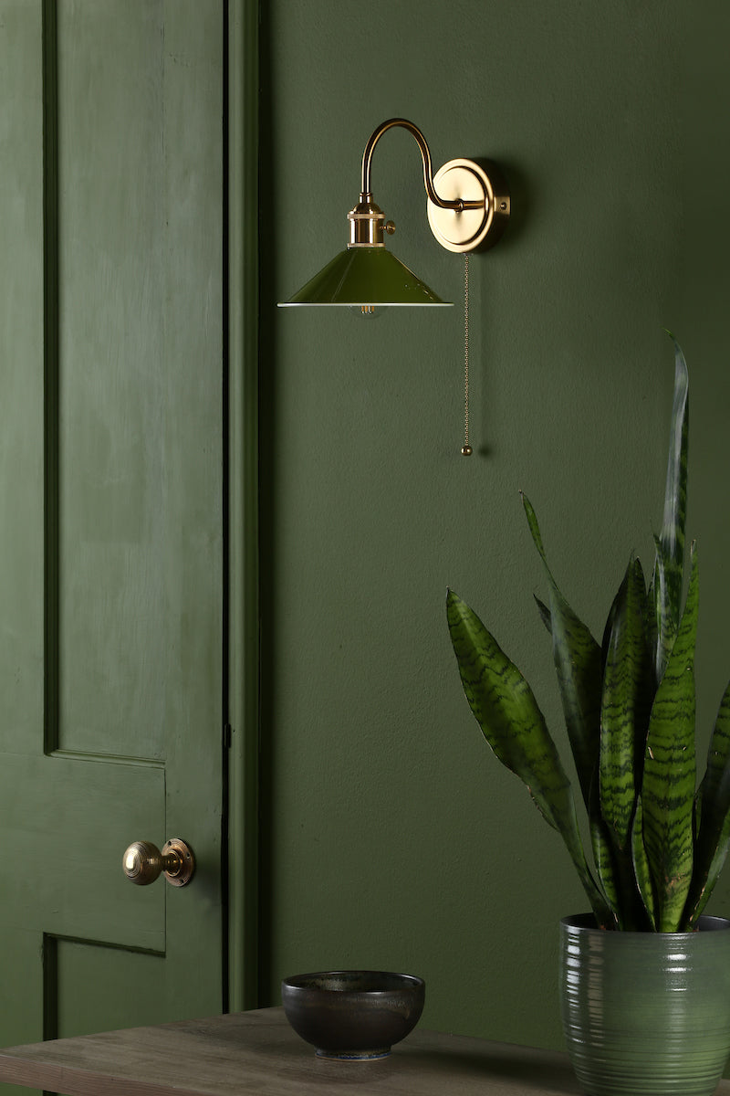 This all-metal version has a vintage-look cone shade of spun steel, finished in an earthy olive green with a white inner. The colour is complemented by the sophisticated natural brass wall plate, lamp holder and chain pull (which can easily be removed if not required).