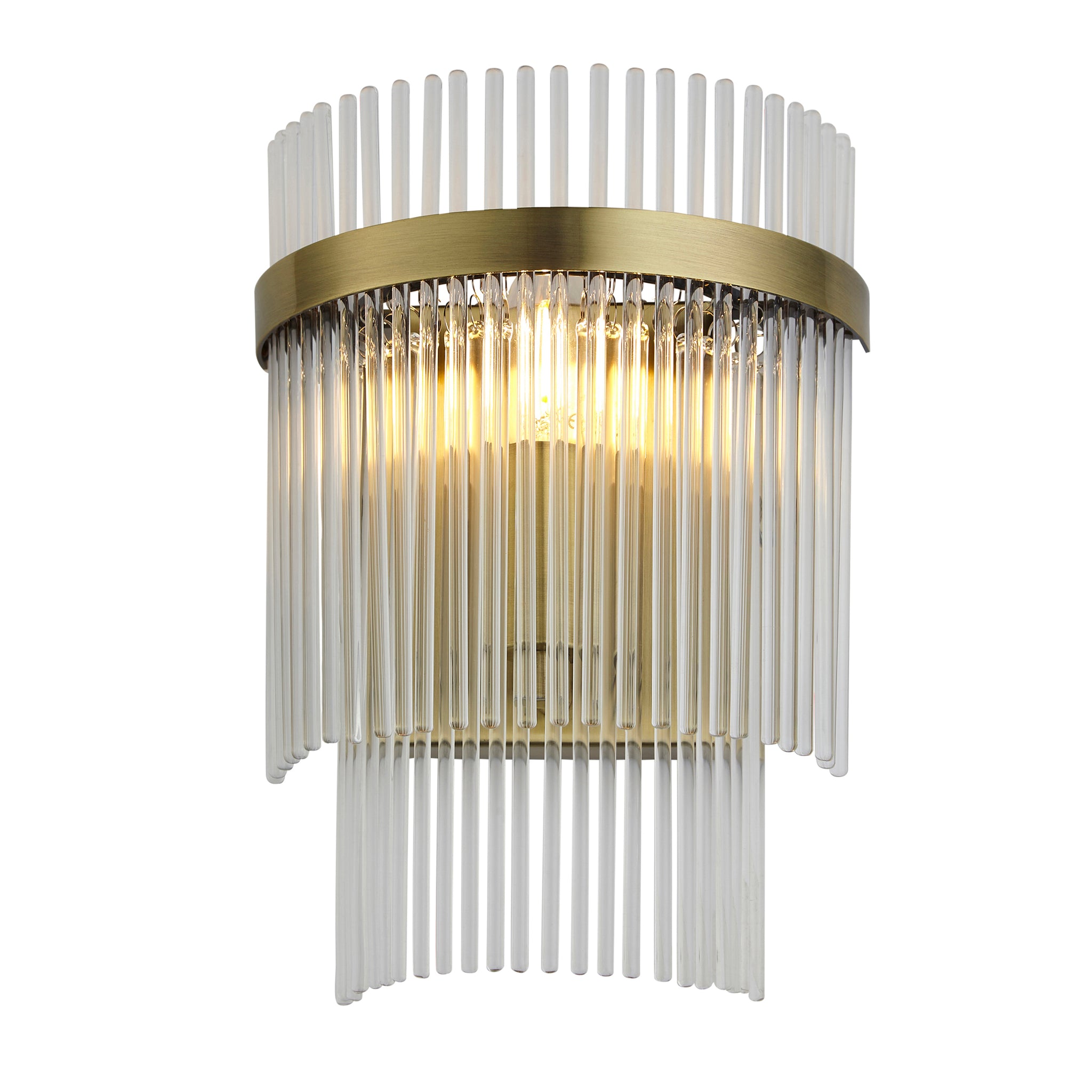 Beautiful wall light in antique brass plated finish. Decorative clear glass rods diffuse the light to create an inviting ambience. Matching items also available to create a cohesive look.
