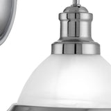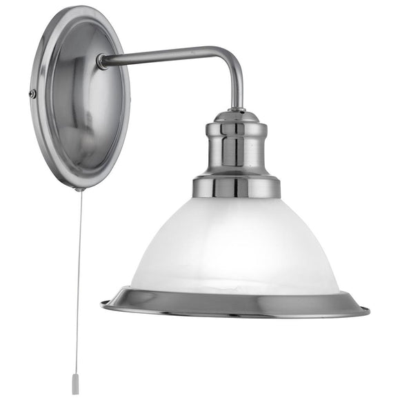 This satin silver wall light with acid glass shade has a simplistic look that will add a retro feel to any dining area. Reminiscent of the style of classic diners and bistros, the wall light comprises of a classic art deco shade finished in a sleek satin silver, with acid glass to provide clean lighting effects. This wall light has a oval shaped satin silver wall bracket and brings a distinctive and elegant style to any setting.
